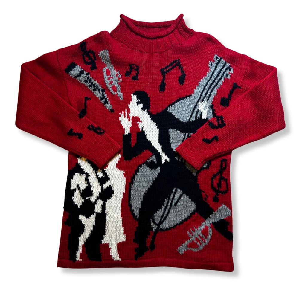ジャズをテーマにしたデザイン性の高いニットセーター。