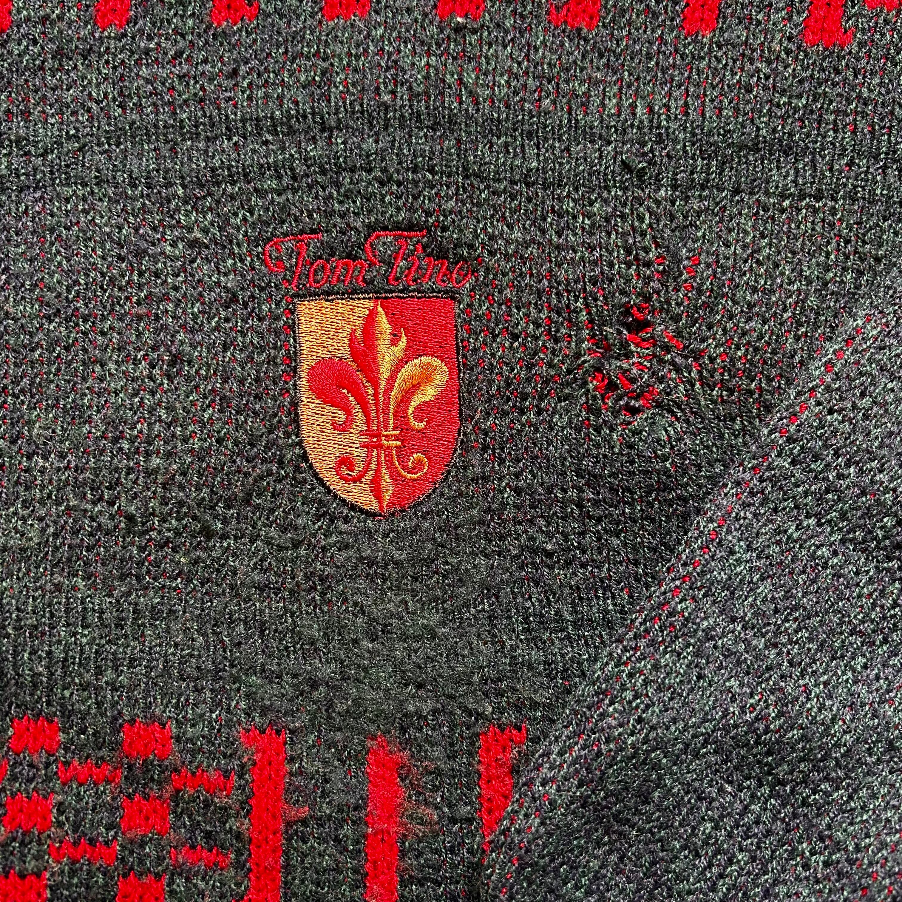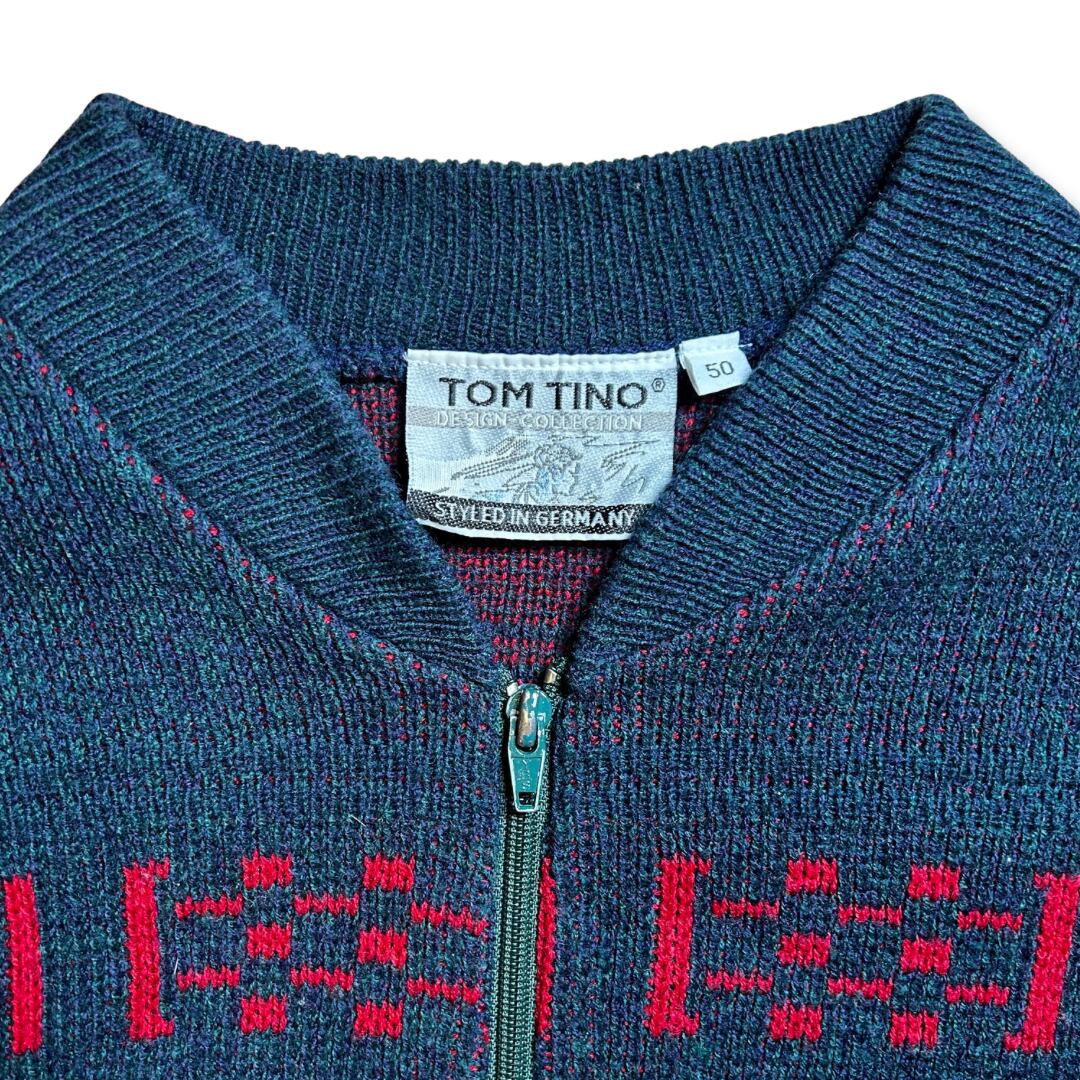TOM TINO トムティノ デザインコレクション ジップアップ ニットカーディガン 50 刺繍エンブレム入り ダークグレー×レッド ヨーロッパ古着 ウール混 総柄デザイン