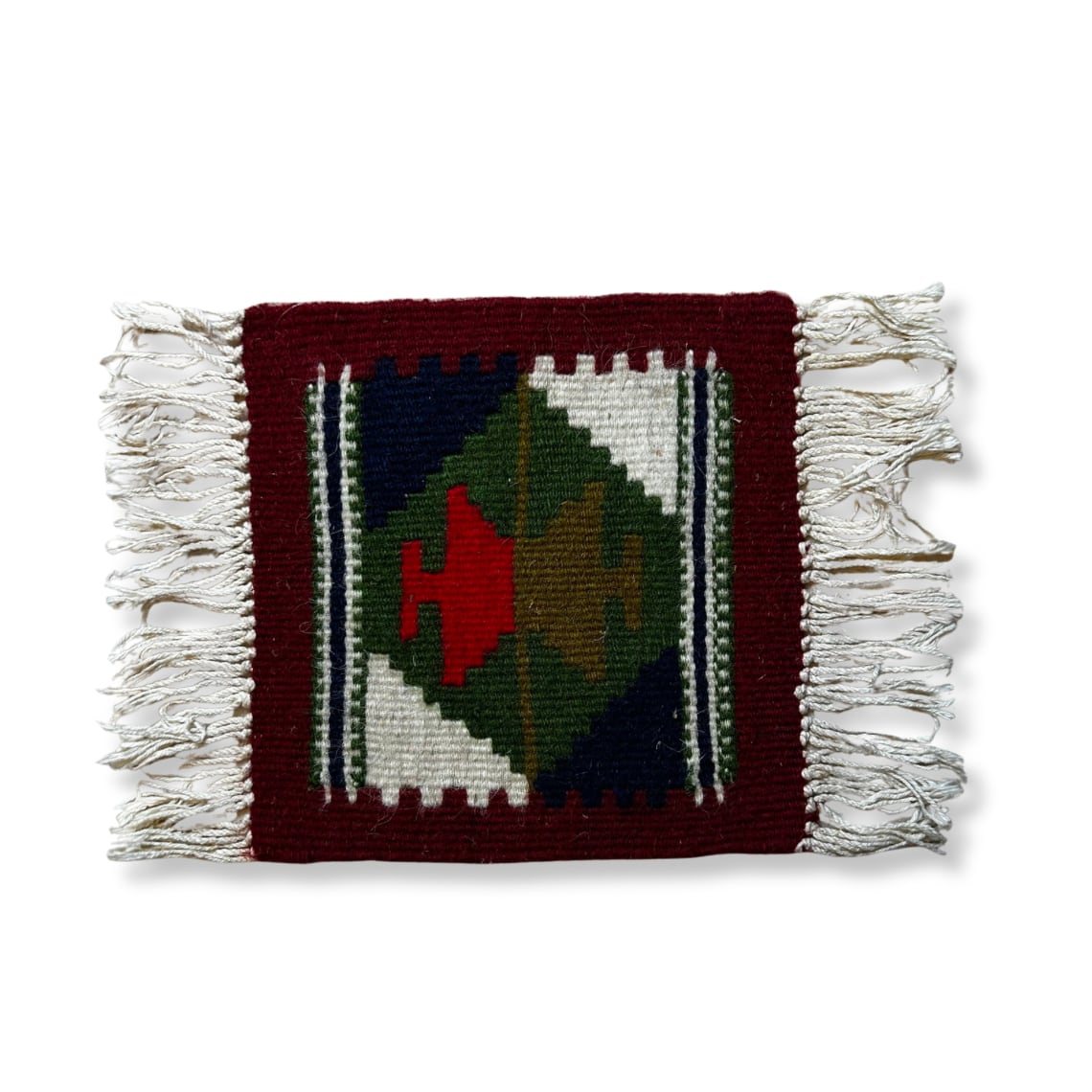 深みのあるボルドーを縁に配し、中央にはグリーン・ネイビー・生成りを基調とした幾何学模様が織り込まれたヴィンテージミニラグ。
