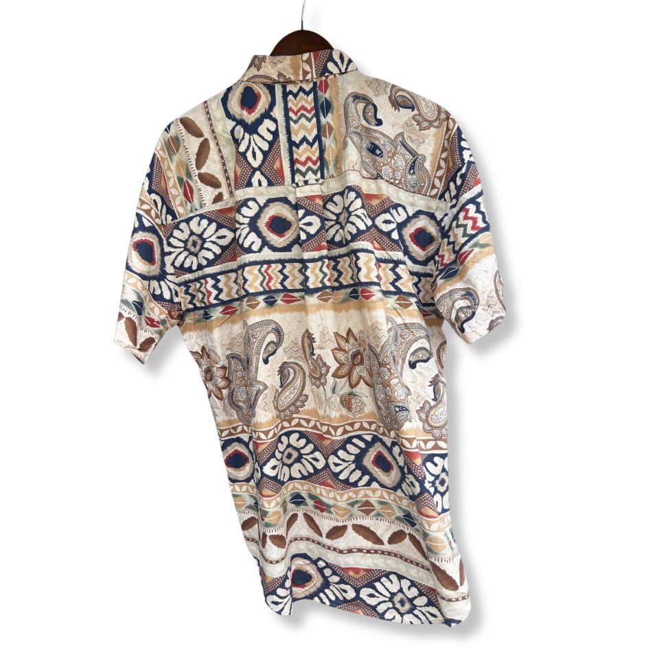 ペイズリーや民族調のパターンを組み合わせた存在感のある一枚。